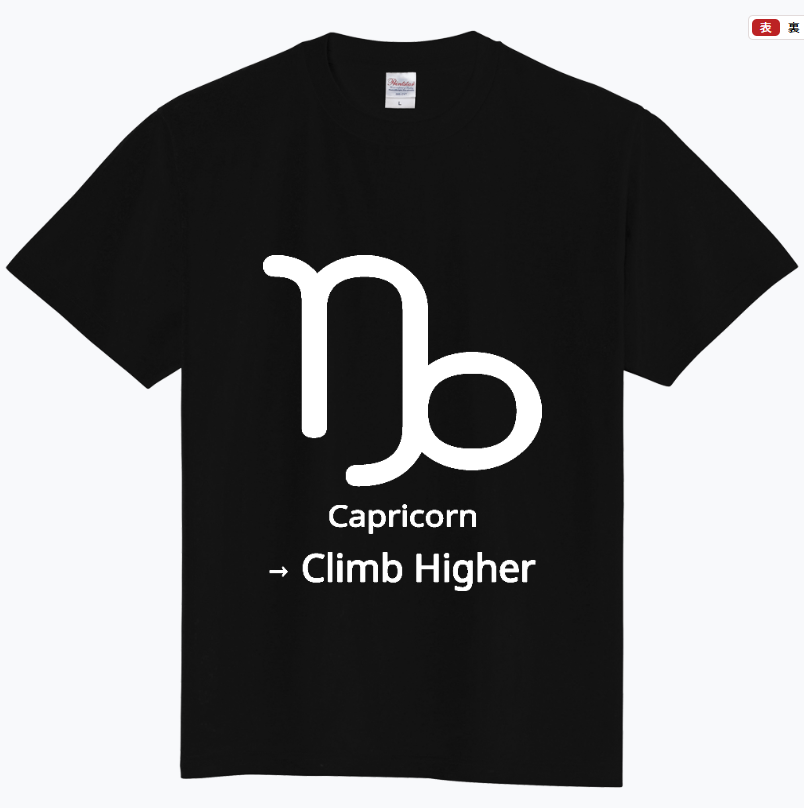 12星座の占星術記号のtシャツ・画像は山羊座です。カラーはホワイトとブラックの2種類。サイズも豊富・送料無料。詳しくはショップをご覧ください。